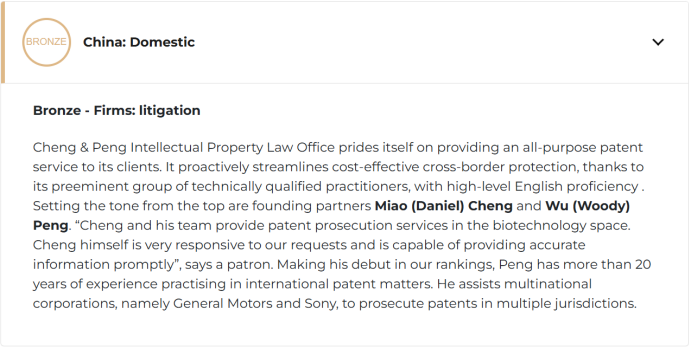 Recently, Intellectual Asset Management (IAM), the world's leading IP media platform, unveiled its prestigious "2025 Patent 1000" rankings. Cheng & Peng Intellectual Property Law Office has been recognized as a "Recommended Firm for Patent Prosecution & Litigation in China" and further distinguished itself by winning the bronze award for "Patent Litigation Firm of the Year" in mainland China. Additionally, founding partner Miao Cheng was honored with the bronze award for "Recommended Individual for Patent Litigation of the Year", while our other founding partner Wu Peng received the bronze award for "Recommended Individual for Patent Prosecution of the Year". These accolades solidify the firm's position as a leader in full-spectrum patent services.